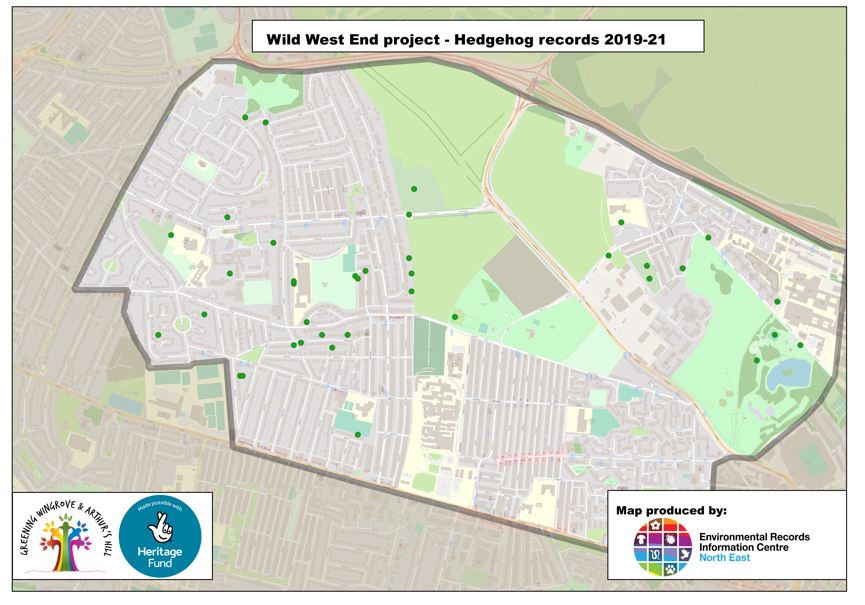 Below is the same map, but is shown as a GIS map with hedgehog sightings marked as a green dot. To enlarge the map press the Ctrl button and plus button on your keyboard at the same time.